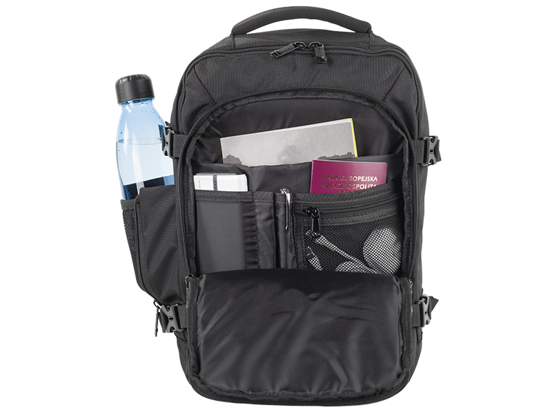 Dzięki bocznej rączce plecak można szybko przenieść, traktując go jak torbę podręczną. Dodatkowo, pasek mocowania do walizki ułatwia przemieszczanie się na lotnisku, zapewniając bezpieczeństwo i wygodę.