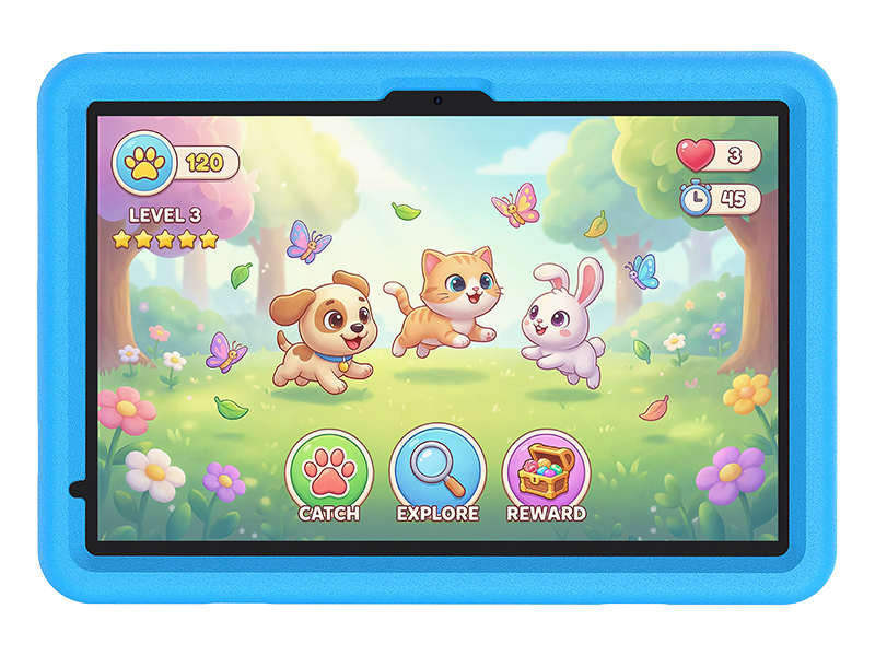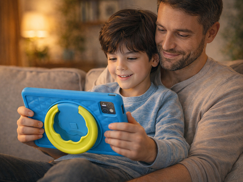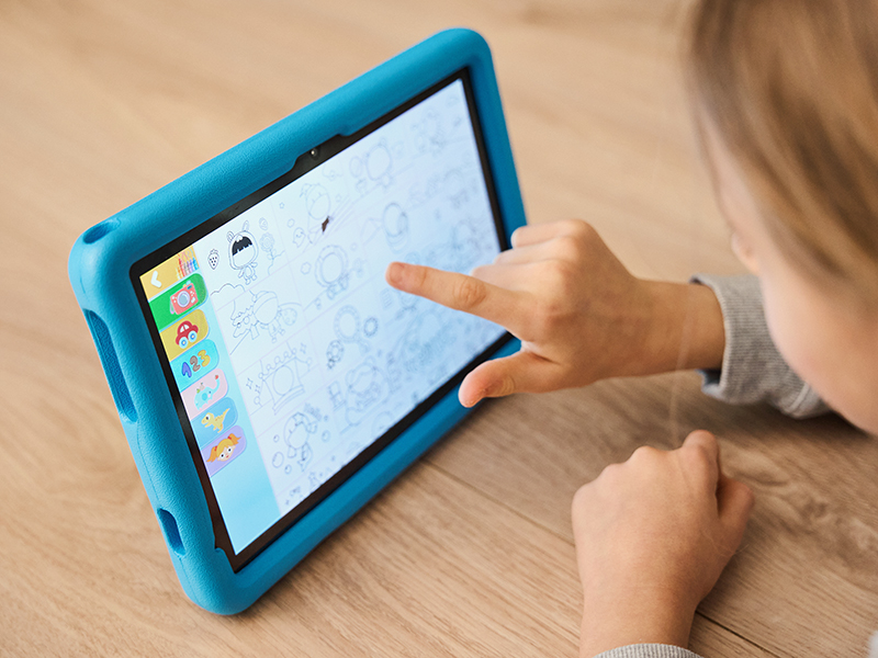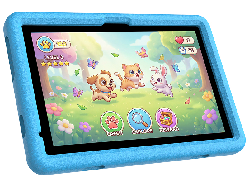 Ekran IPS o przekątnej 7 cali zapewnia dobre odwzorowanie kolorów oraz szerokie kąty widzenia. Dzięki temu treści edukacyjne, gry i filmy pozostają czytelne i przyjemne w odbiorze, niezależnie od sposobu trzymania tabletu. Kompaktowy rozmiar ułatwia korzystanie z urządzenia młodszym dzieciom.